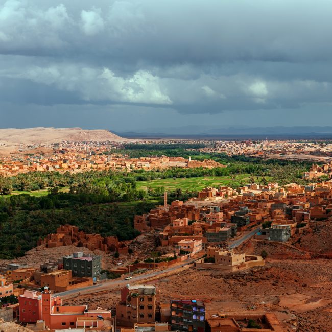 This morning, after exploring the famous **Kasbah of Ait Benhaddou** and its iconic film locations, we will begin our journey to the stunning **Todra Gorge**, a massive canyon carved into the **Atlas Mountains**. Along the way, we’ll make a stop at **Skoura**, located in the **Valley of a Thousand Kasbahs**. Here, you can enjoy a light trek through the lush **date palm oasis**, where you'll see the unique, sandcastle-like homes scattered throughout the landscape. This peaceful walk offers a glimpse into the traditional Berber lifestyle in this picturesque valley.